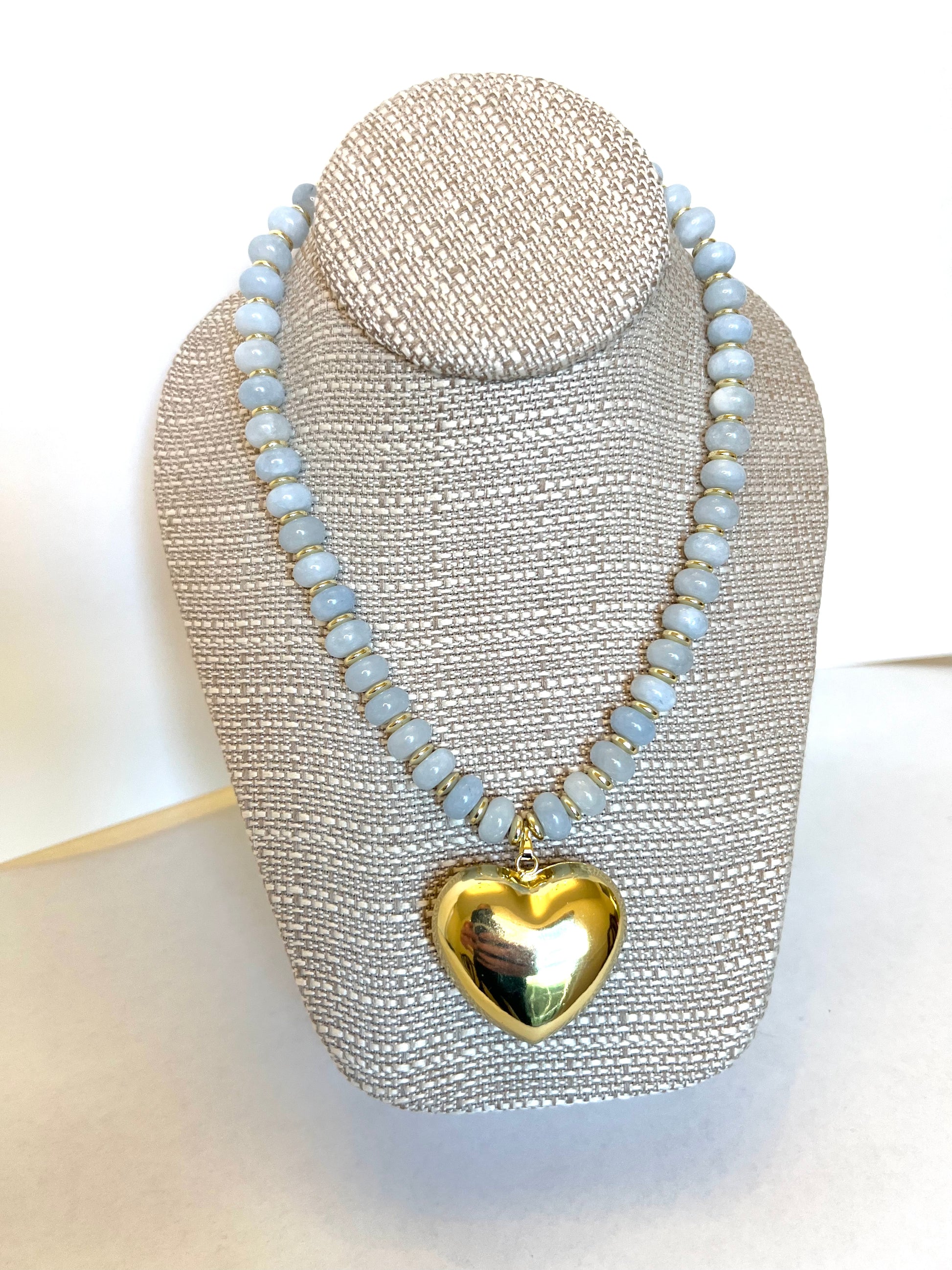 Light Blue Rondelle+Large Gold Heart Charm Necklace